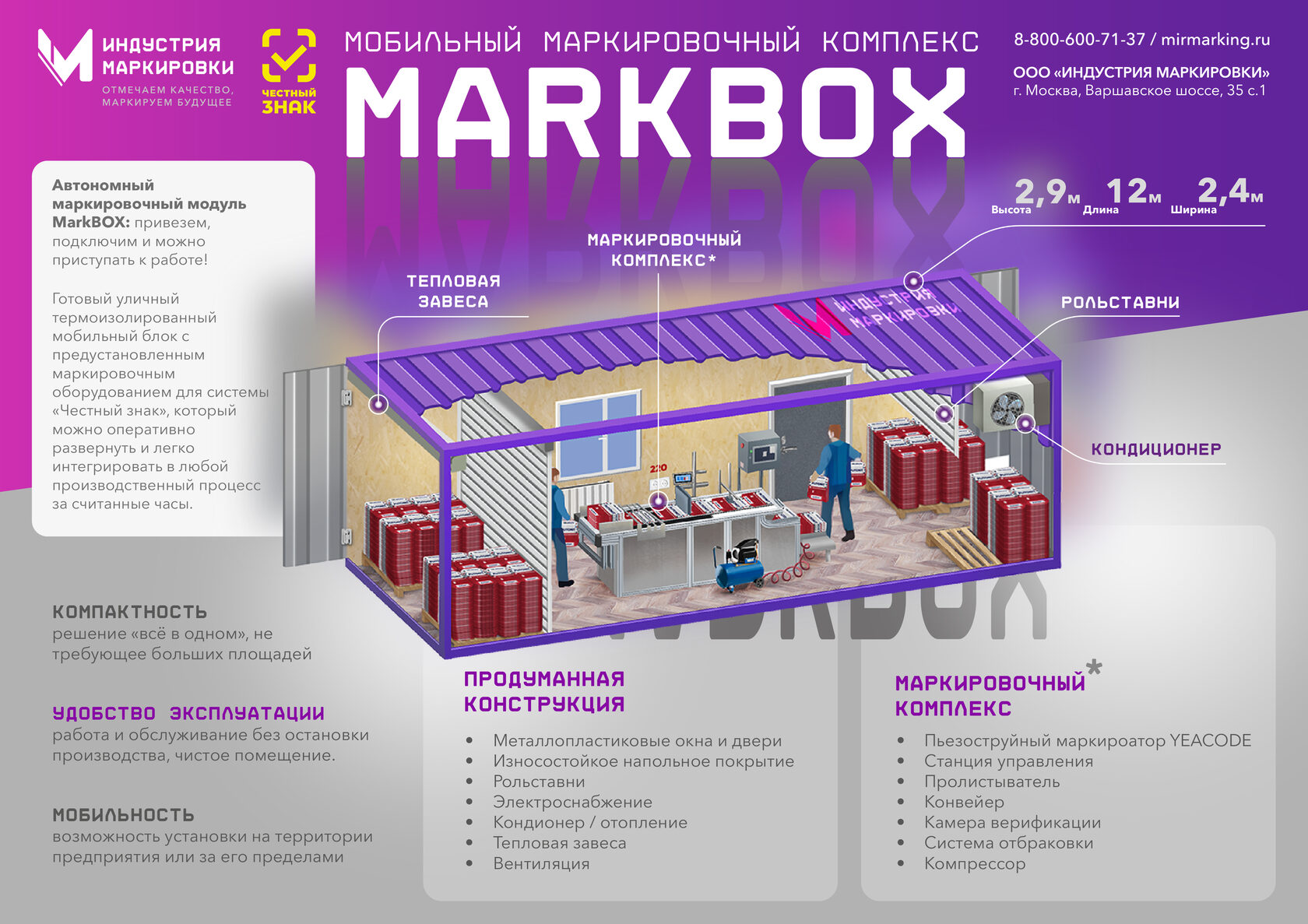MarkBox представляет собой термоизолированный автономный модуль, в который уже интегрировано всё необходимое оборудование для маркировки кодом DataMatrix (пьезоструйный маркиратор Yeacode), верификации и передачи данных в систему «Честный знак». Комплекс полностью готов к работе. Решение особенно актуально для производств, где нет возможности или времени на интеграцию маркировочных решений в производственную линию.